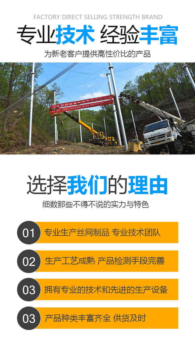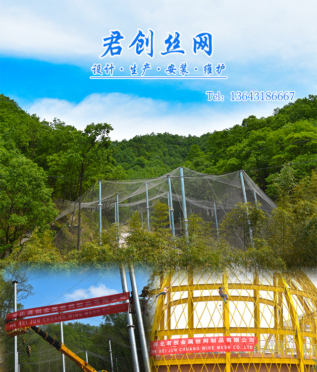 河北君创金属丝网制品有限公司位于富有“丝网之乡”美誉的—河北安平。建于1999年,交通便利,是一家集生产,加工,销售为一体的大型丝网厂家。本厂专业生产各种类型的丝网。产品类型齐全,主要包括:不锈钢绳网,钢丝绳网,百鸟园网,鸟语林网,桥梁围栏网绳网,不锈钢扣网,卡扣绳网,防坠网,幼儿园防坠网,高层防坠网,商场防坠网。产品宽幅可达50m,丝径达6.0mm,技术指标达到国家同类产品标准,可以接受较大的定单并保证质量和生产期限。 河北君创金属丝网制品有限公司一直是以“...